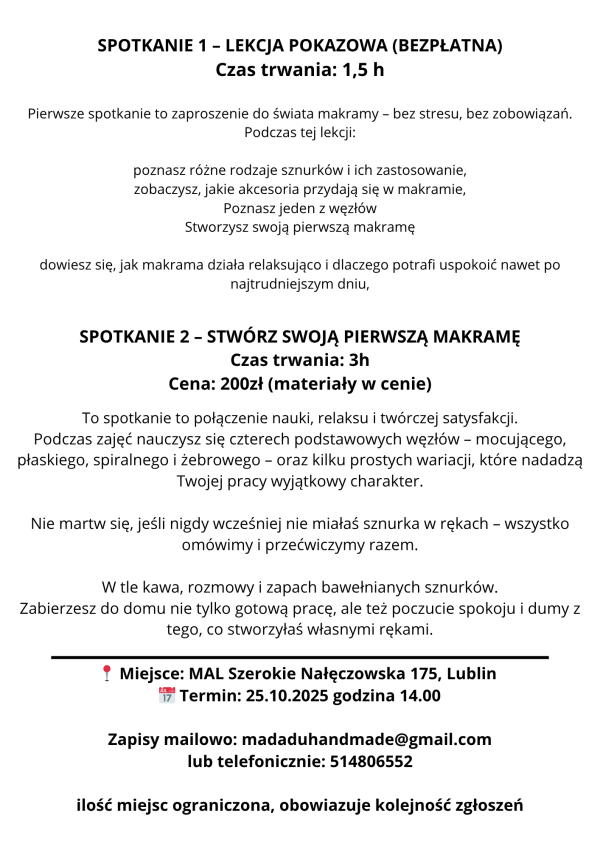 Pierwsze spotkanie to zaproszenie do świata makramy – bez stresu, bez zobowiązań.