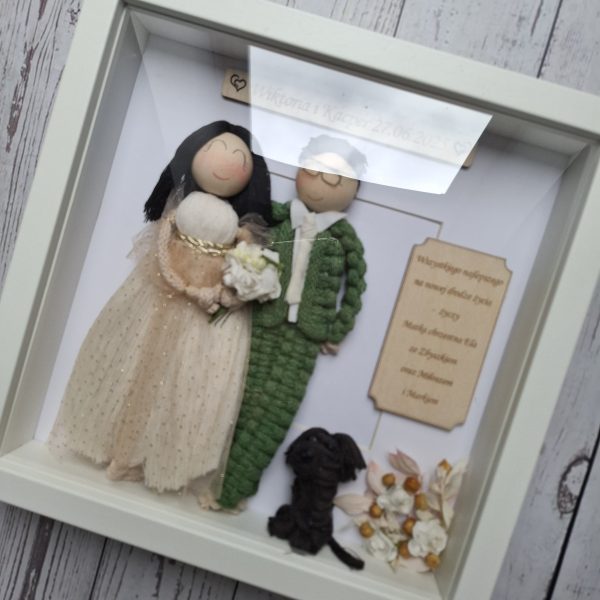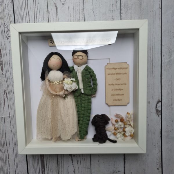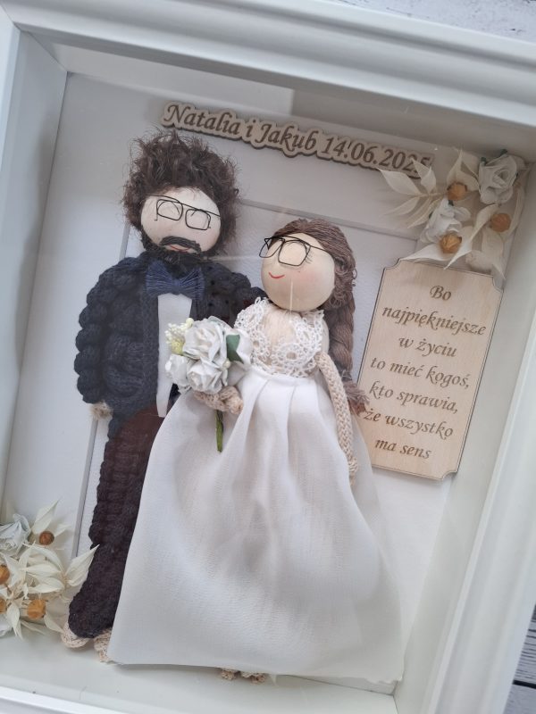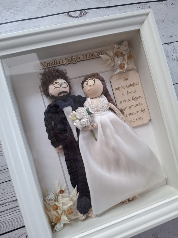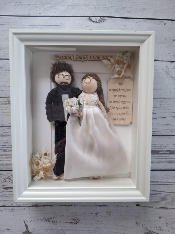 Z okazji Waszego wyjątkowego dnia ślubu proponuję spersonalizowaną pamiątkę, która pozwoli Wam na zawsze zachować magię tego momentu. Ręcznie wykonane sznurkowe laleczki w eleganckiej białej gablotce z plexi to nie tylko unikalna dekoracja, ale przede wszystkim piękna, osobista pamiątka, która przez lata będzie przypominać o miłości, wzruszeniach i radości tego szczególnego dnia.